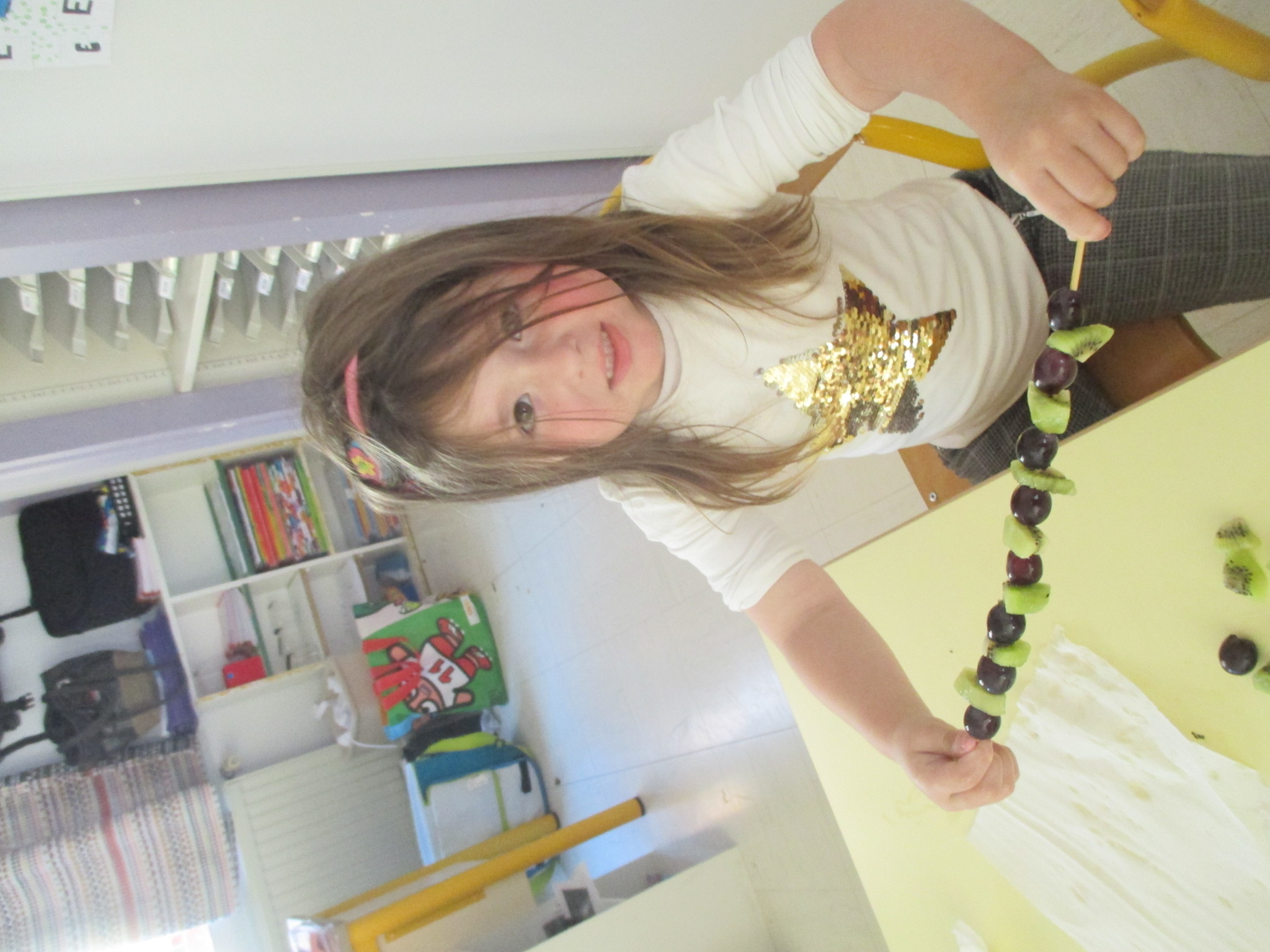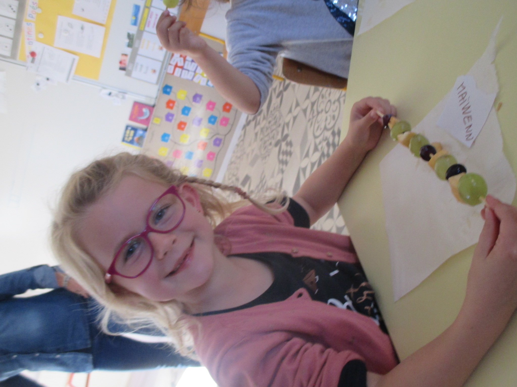 Les MS devaient choisir deux fruits puis réaliser une brochette en respectant un algorithme de 2 éléments: pomme - raisin - pomme - raisin.