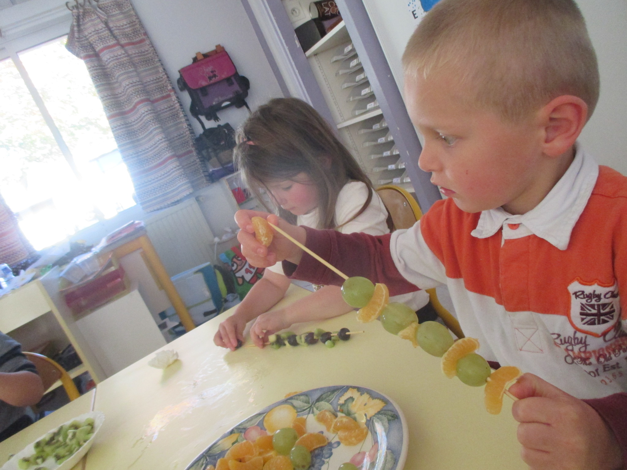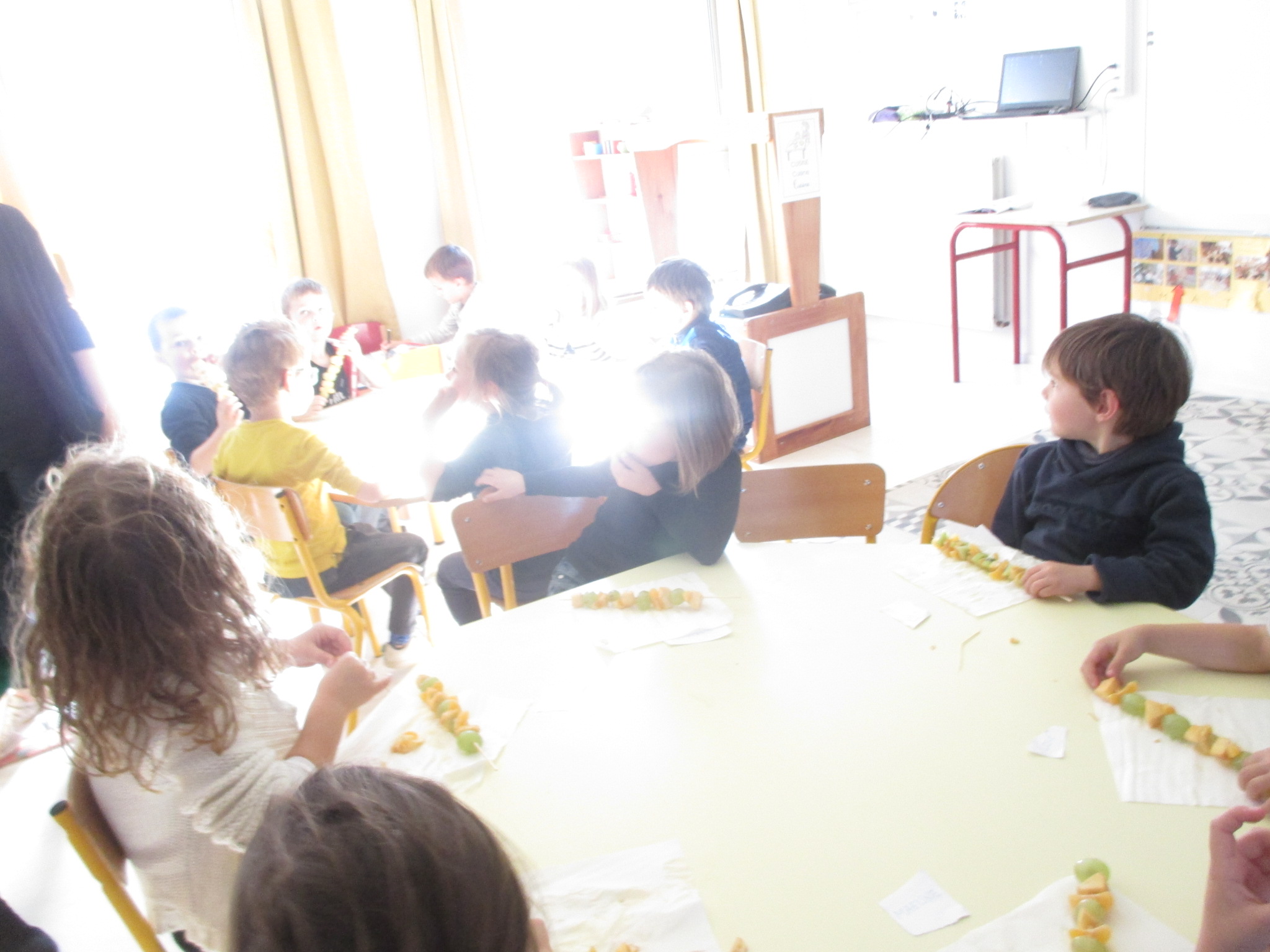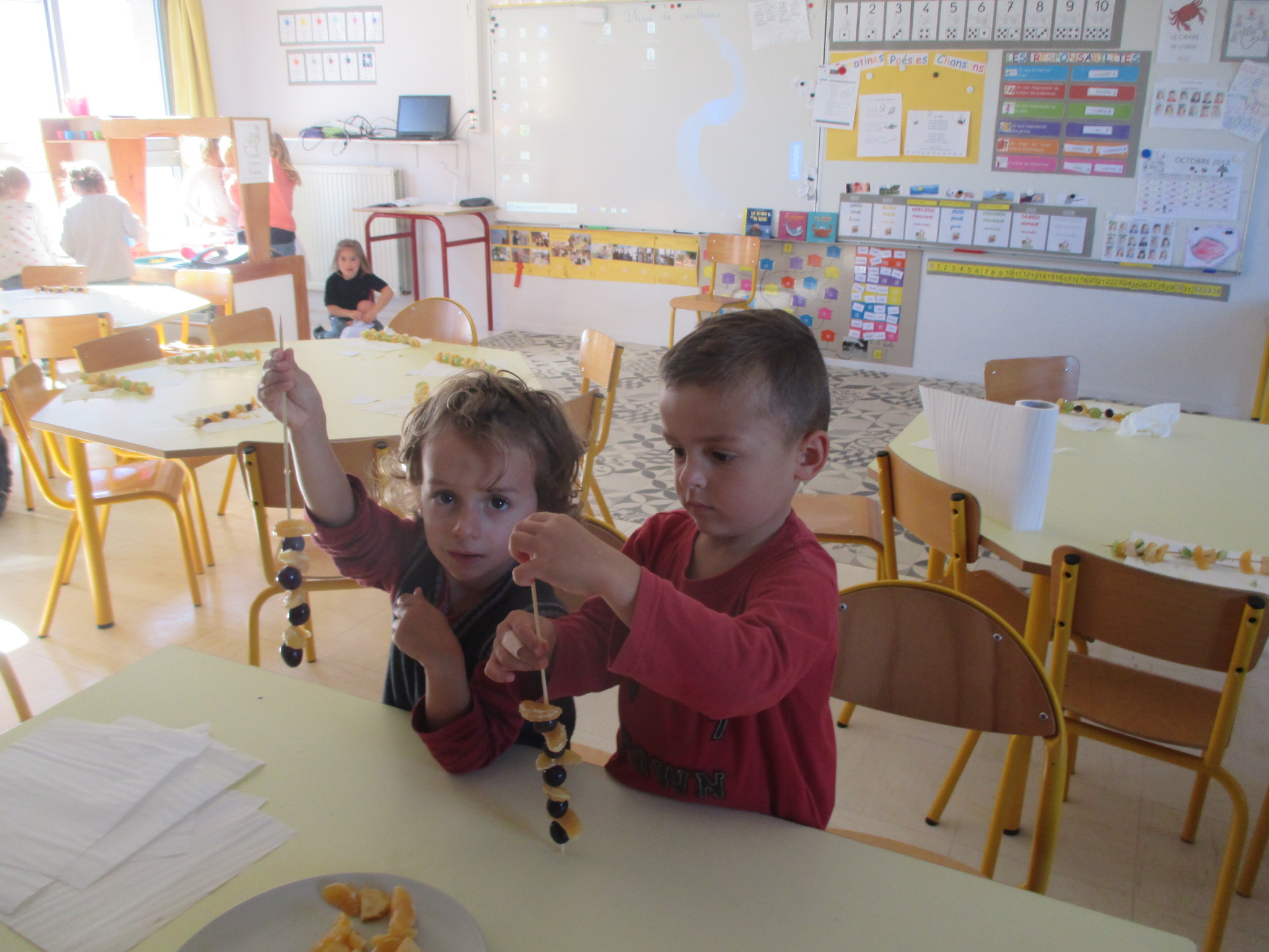 Jeudi 18 octobre, tous les enfants de la classe ont confectionné des brochettes de fruits. Ils avaient le choix entre plusieurs fruits: le raisin blanc, le raisin noir, la pomme, le kiwi et la clémentine.
